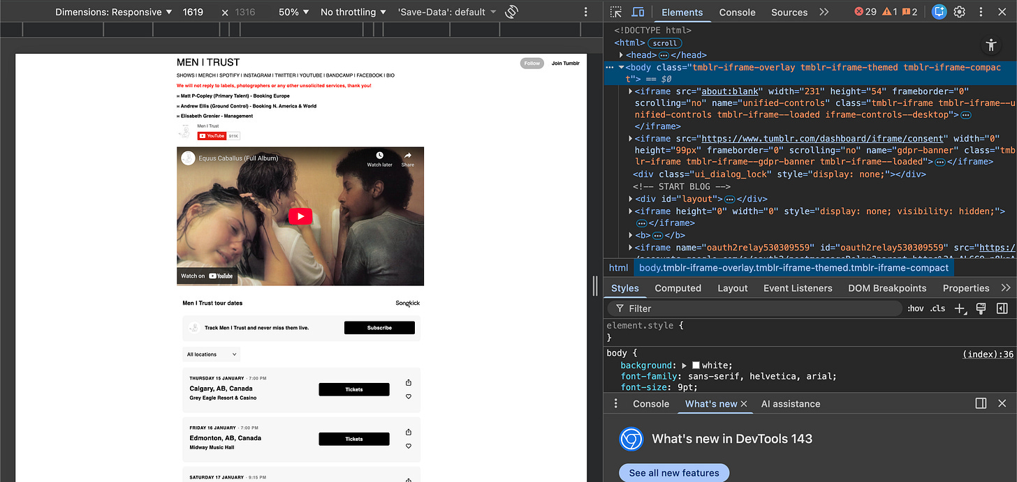 And if you really, really want to make sure you own the masters, just start your own record label. Sufjan Stevens has Asthmatic Kitty. Lykke Li with LL Recordings. Men I Trust is so unequivocally independent I can’t even put a label on it. They work with Return to Analog for distribution. They use Tumblr for their website.