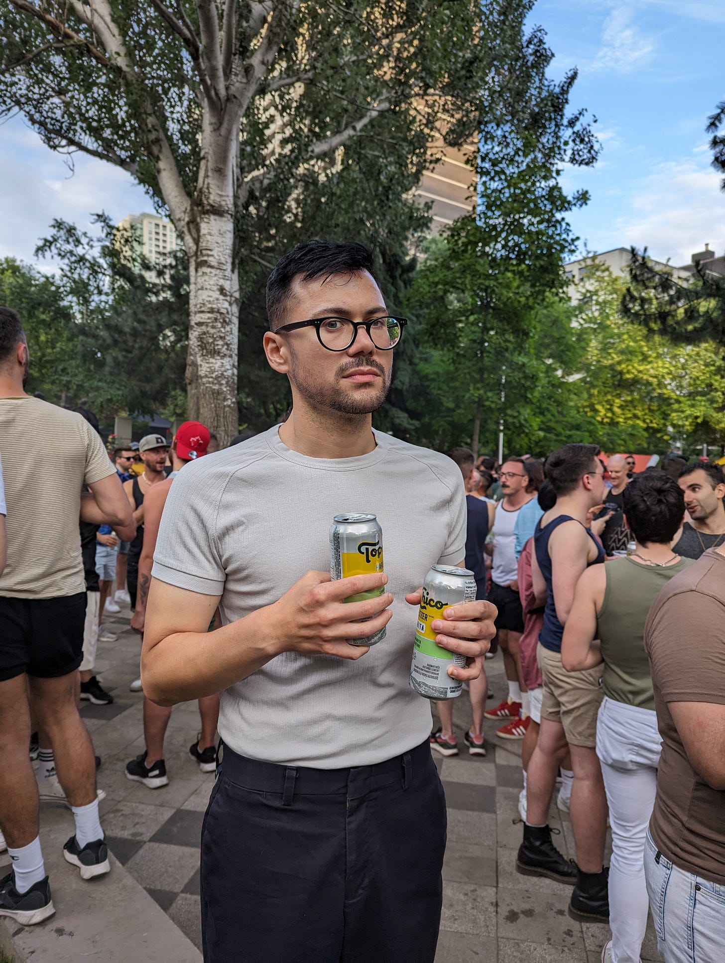 We decide to head to The 519 to check out the scene. The drink menu honestly feels like a bargain compared to Budweiser Stage. I couldn’t decide between a shitty beer (Heineken) or a shitty hard seltzer (Topo Chico Margarita). I got a marg and so did Daniel. It was about $28 with no tip option. All the funds go towards The 519 community centre for 2SLGBTQ+ people. Gay rights! Daniel purchases a round and I ran into a friend, who purchases a round. Shout out to Michael!